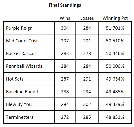 The comments below by Steve Sandike sum up the standings nicely: The lead changed hourly, for the whole tournament. It was the closest spread from first to eighth since we started this thing in 2016! Only 2.87% winning fraction separated first from eighth! But in the end, it was Purple Reign finishing on top, winning 51.7% of their games. Second place goes to Mid Court Crisis, @ 50.5%.